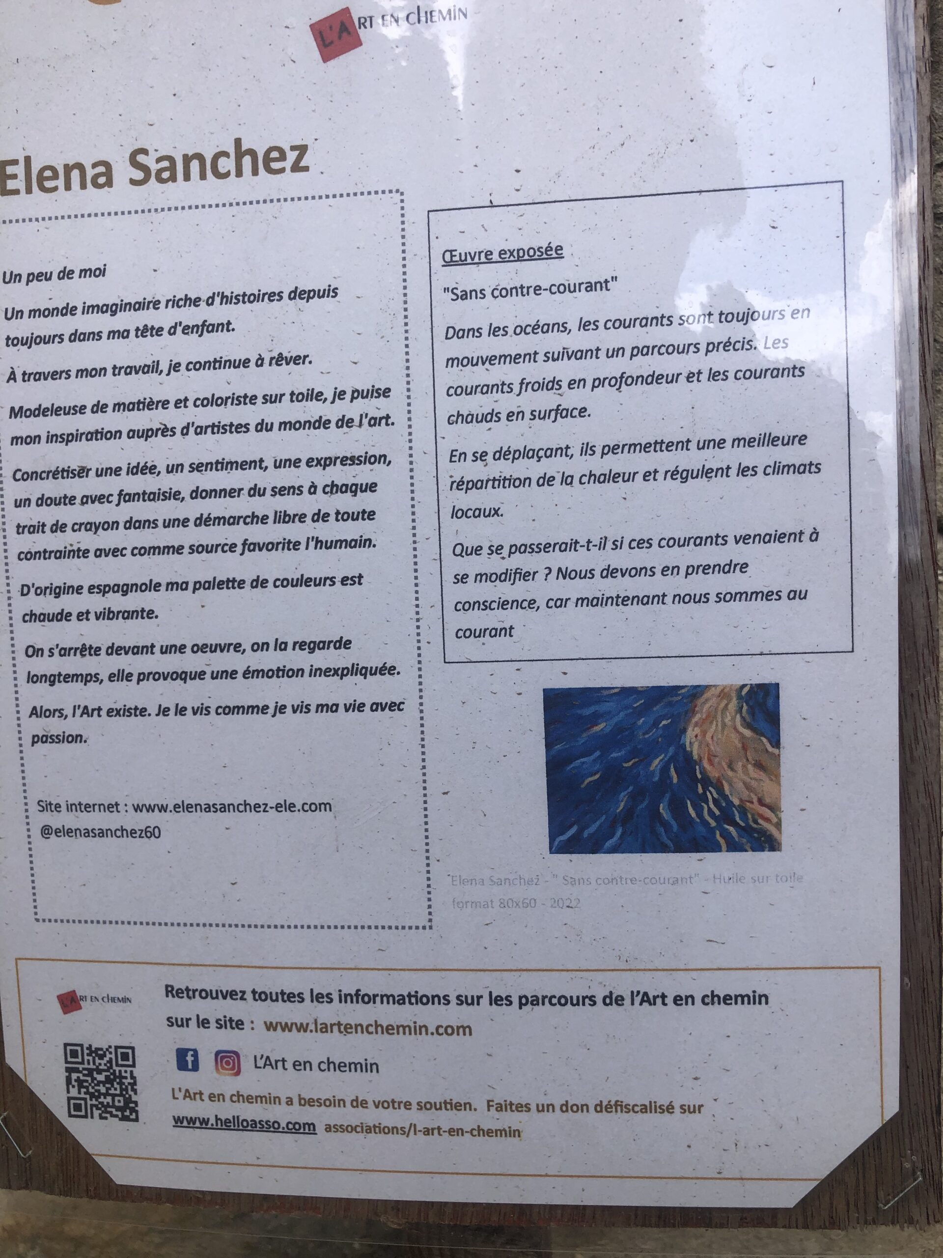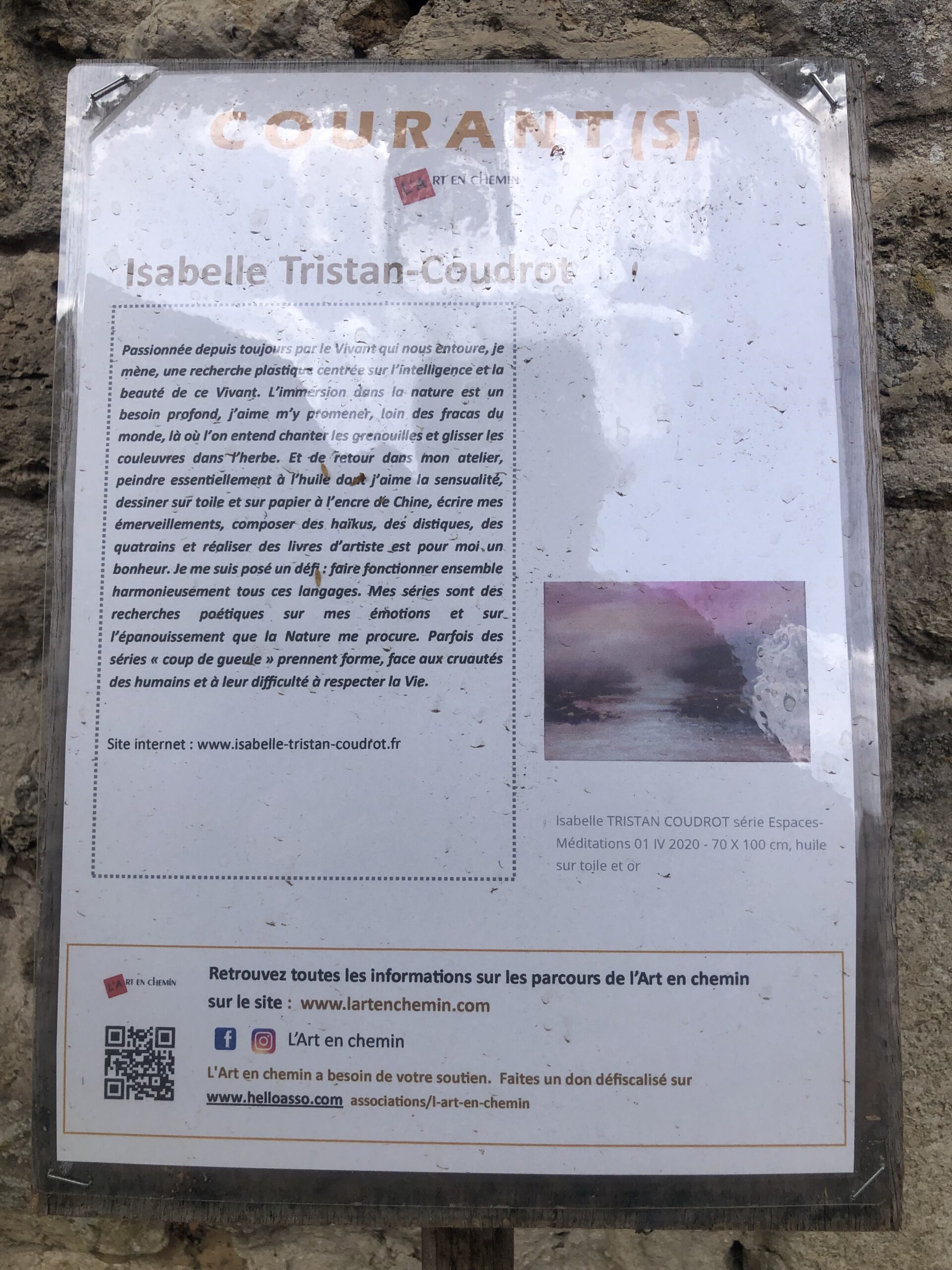 Pour la neuvième édition de L’Art en chemin, douze communes de l’Oise s’associent pour une véritable exposition à ciel ouvert. C’est librement et en pleine nature que les promeneurs découvrent les œuvres de 34 artistes plasticiens (peintres, sculpteurs, photographes, paysagistes) et les nouvelles de 36 auteurs sur le thème « Courant(s) ».